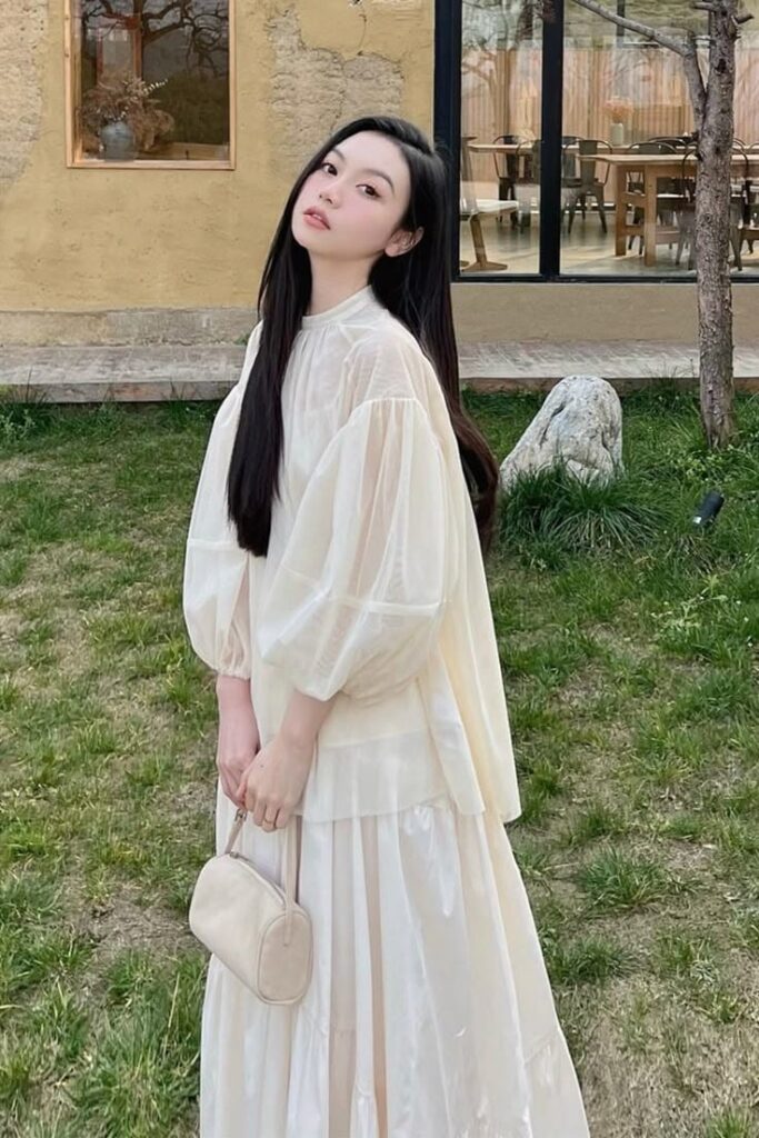 - Chi tiết điểm nhấn vừa đủ: Tay bồng, bèo nhún nhẹ, cổ nơ nhỏ hoặc cúc ngọc trai – đều là những điểm nhấn rất “Hàn” và cực kỳ tôn dáng.
