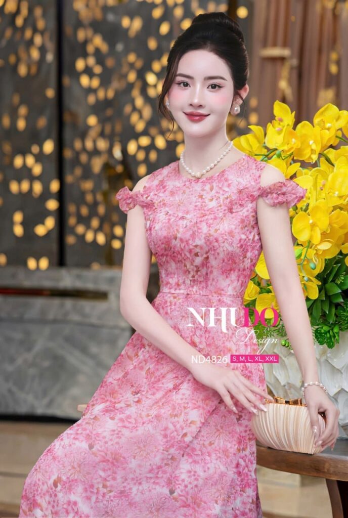 Thiết kế dáng A thanh thoát, phần eo chiết nhẹ tôn lên vóc dáng mềm mại, kết hợp tay váy nhún bèo nhỏ càng làm nổi bật nét nữ tính ngọt ngào. Họa tiết hoa nhí màu hồng pastel trải đều khắp thân váy, mang đến cảm giác trong trẻo, thuần khiết mà không hề đơn điệu.