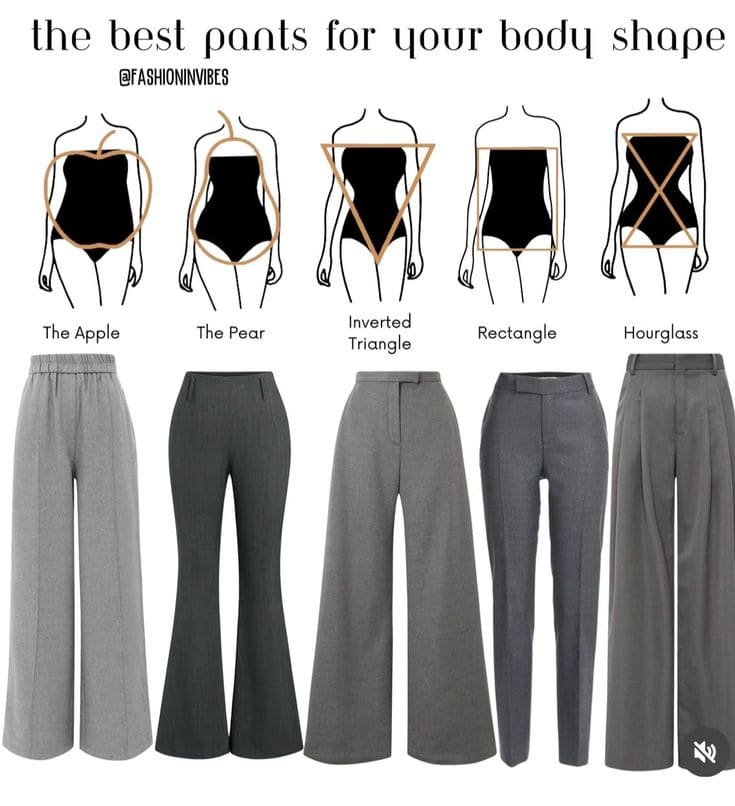 - Dáng tam giác ngược: Hãy mặc quần cạp cao palazzo, tránh quần bó – giúp tạo cảm giác cân đối phần dưới.